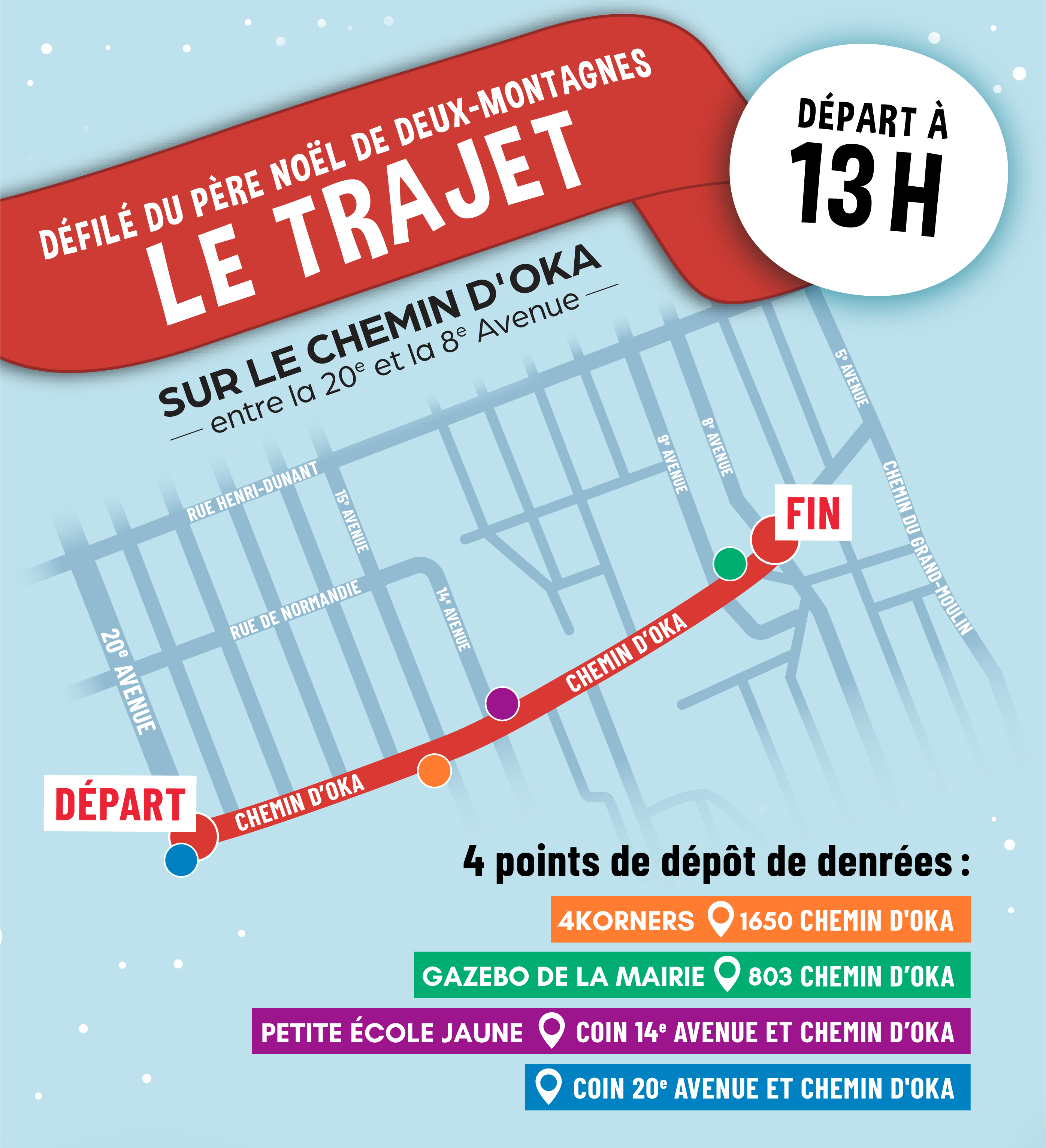 Des entraves sont à prévoir pour les citoyens du secteur de la 20e Avenue (entre rue Guy et chemin d’Oka) et sur le chemin d’Oka (entre la 20e et la 5e Avenue). Les rues donnant sur ces artères seront fermées à la circulation dès 7 h 30, le matin du 7 décembre, et seront rouvertes dès la fin du défilé. Il est donc encouragé de prévoir ses déplacements pour cette période.